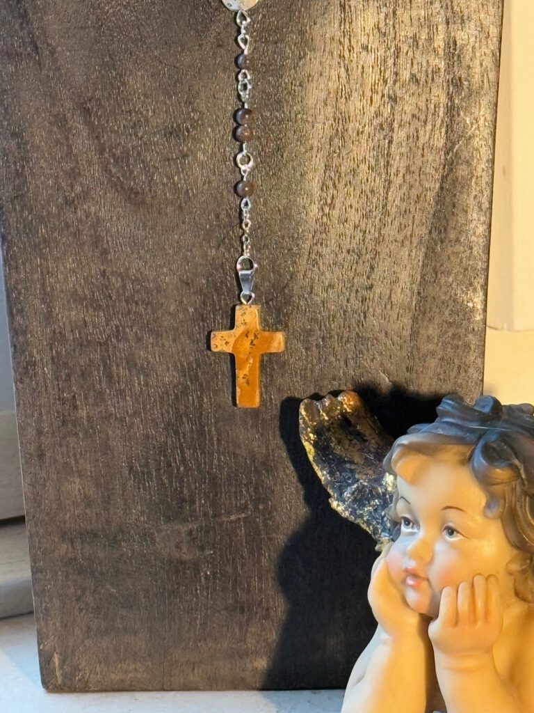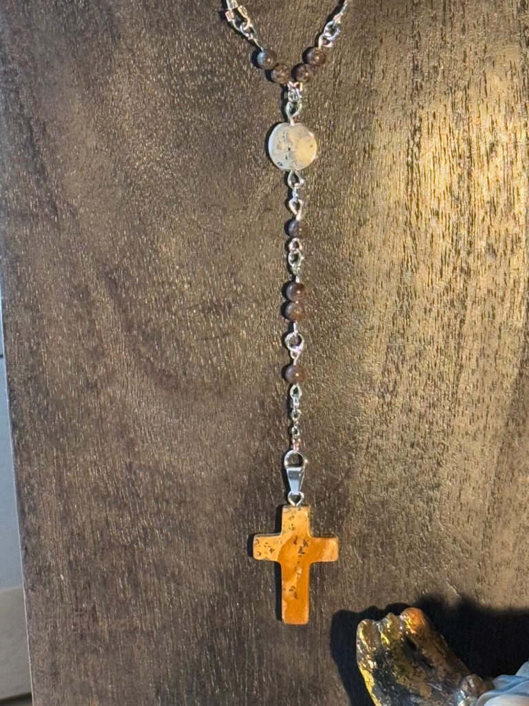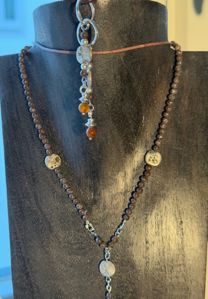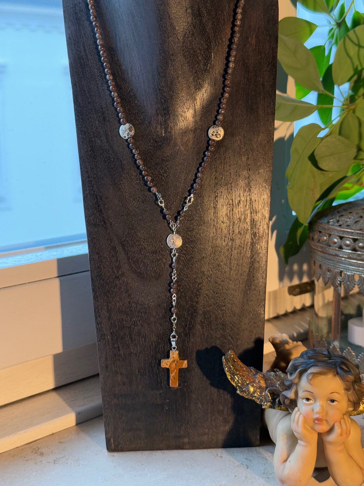 Kette aus Schneeflocken-Obsidian, mit einem Kreuzanhänger aus Jaspis. Den Part um den Hals herum bildet ein antikbraunes Lederband und die weiteren Schmuckdetails betehen aus silberfarbenen Elementen.